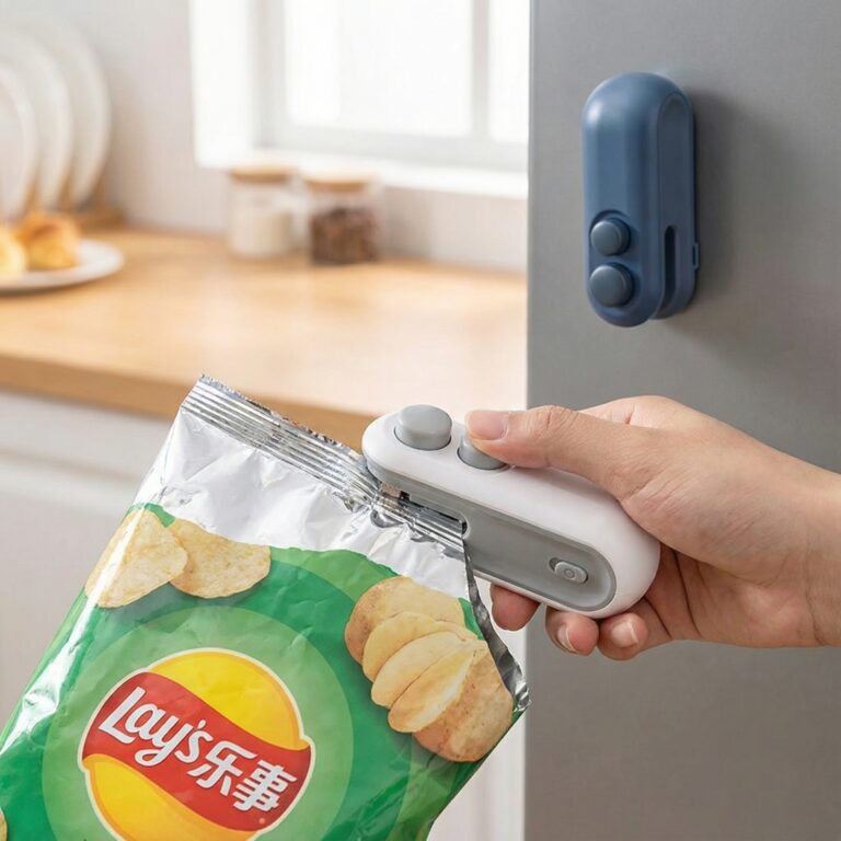 adalah penyegel sekaligus pembuka kantong plastik. Anda dapat dengan mudah menyegel kantong plastik dan menjaga kesegaran makanan Anda, serta dengan mudah membuka kantong plastik dengan pisau baja tahan karat yang tajam.Bisa diisi ulang